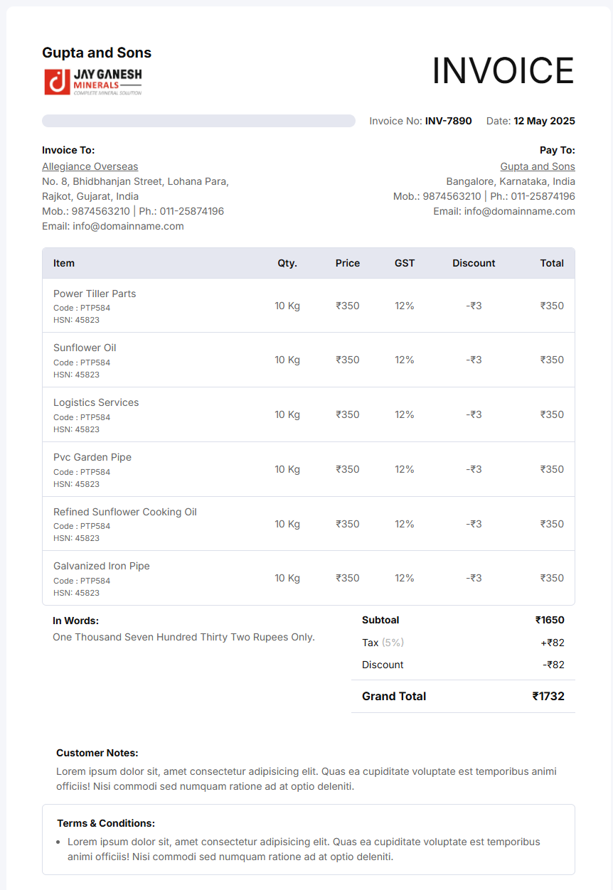 | Customer Details | Name, billing address, contact, GSTIN | Sky View Barter Pvt. Ltd., 45 MG Road, Mumbai, GSTIN: 27XYZ4567A1Z9 |