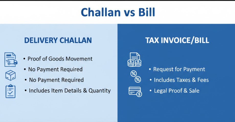Details Included | Challan no., date, goods description, quantity, receiver | Invoice no., date, buyer & seller details, item description, tax, total payable |