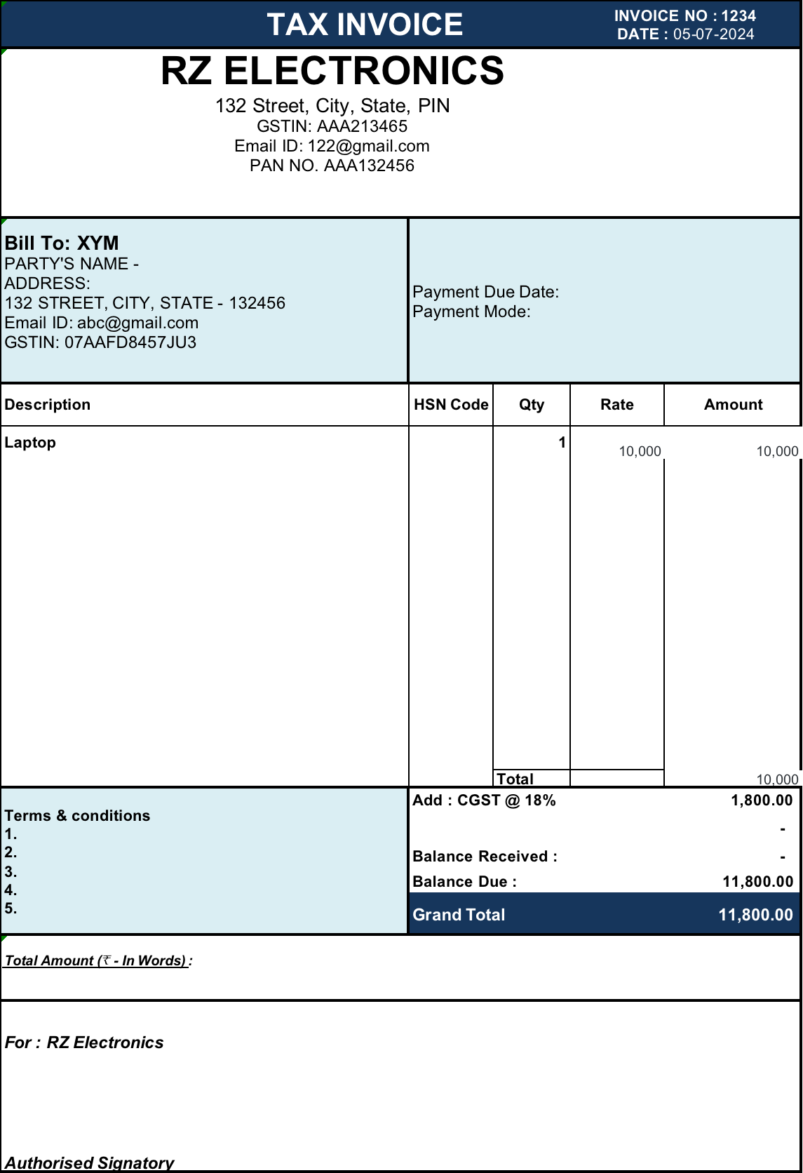 - GST rates and amounts (CGST, SGST, IGST)