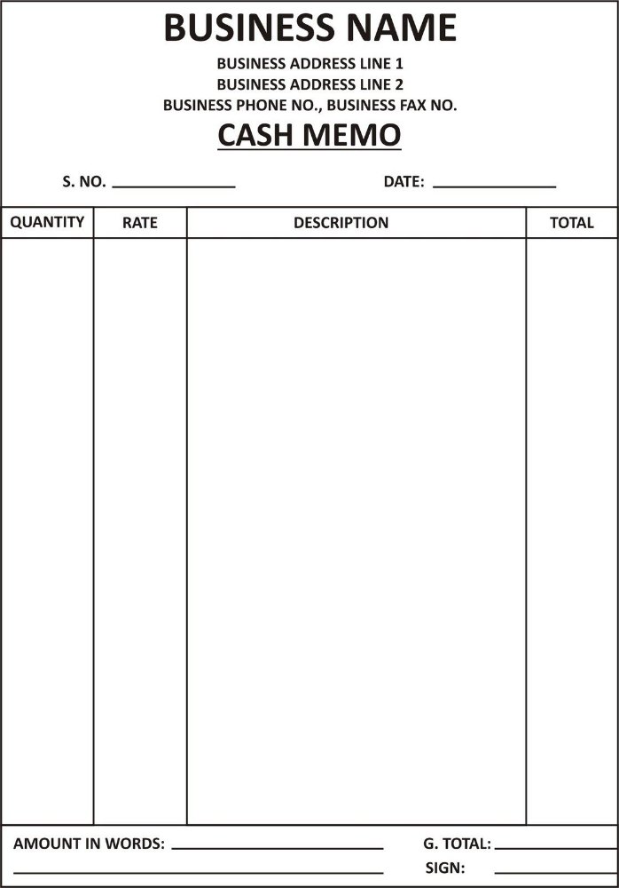 - Cash Memo: Contains basic information such as the item name, quantity, price per unit, and total cost. It does not typically include tax details or payment terms because the transaction is settled immediately.