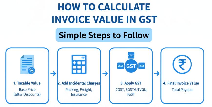 Calculating invoice value under GST involves adding up the taxable value, incidental charges, and the applicable GST. Here’s a step-by-step method: